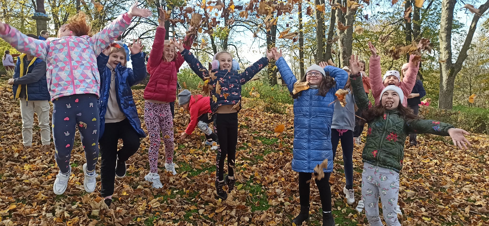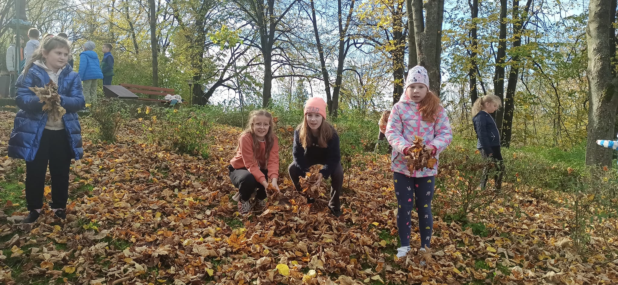 W tym dniu pogoda była wyjątkowo piękna. Nie brakowało promieni słońca i ciepłych podmuchów wiatru. Uczniowie bezpośrednio obcowali z przyrodą, rozpoznawali rodzaje drzew po liściach i owocach oraz zbierali jesienne skarby. Dzieci świetnie bawiły się na świeżym powietrzu.