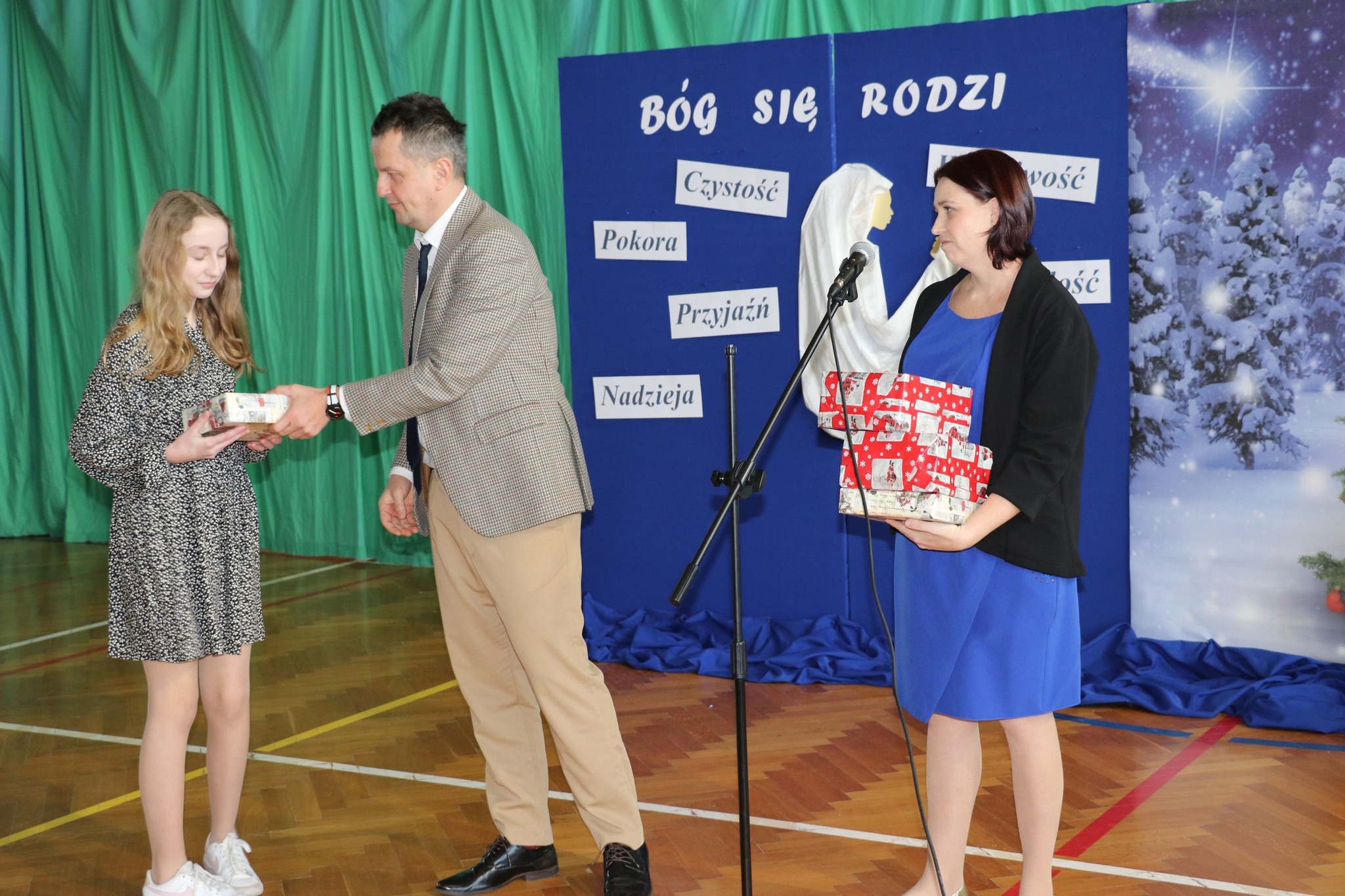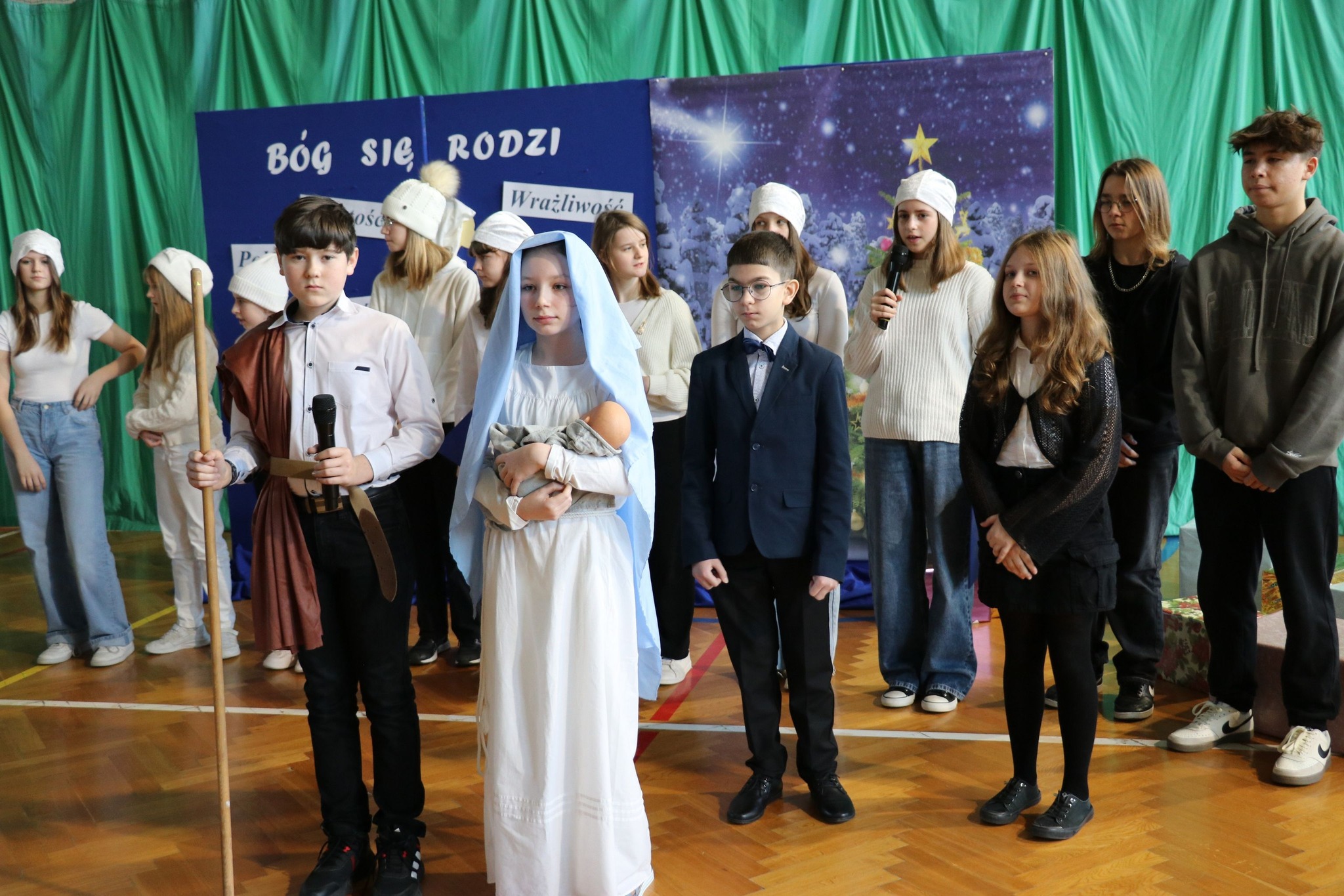 Jasełka od wielu lat wpisane są w kalendarz uroczystości organizowanych w naszej szkole. W tym roku również przygotowaliśmy przedstawienie, w którym to poruszyliśmy dwa ważne aspekty życia codziennego (aspekt duchowo-religijny oraz społeczno-obyczajowy). Zabieganie, dążenie do doskonałości, stawianie na pierwszym miejscu własnej wygody, chęć posiadania przysłaniają nam często Bożą naukę, która jest cicha, skromna i przepełniona miłością. I takie przesłanie popłynęło z bożonarodzeniowego przedstawienia do wszystkich uczestników spotkania wigilijnego w dniu 22 grudnia 2023r.